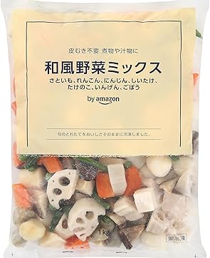 旬の時期に収穫されたさといも、れんこん、にんじん、しいたけ、たけのこ、いんげん、ごぼう、をミックスして冷凍しています。