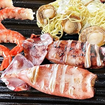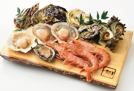 - 特大赤海老 3尾、北海道産帆立 3個、長崎県産サザエ 3個、瀬戸内海産牡蠣 3個、スルメイカ 2杯
