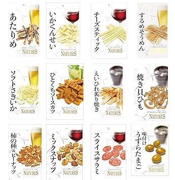 ネイチャーズおつまみ、いか・チーズスティック・ソースカツ・えいひれ・貝ひも・柿の種・ミックスナッツ・うずらの卵の12袋アソートセットです。