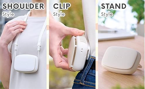 付属のネックストラップを使うことでポーチのような見た目になり、背面のクリップを使ってベルトやズボンにかけることでTシャツなどの内側に風を送り込むことも可能です。