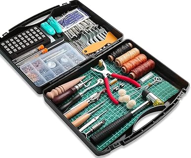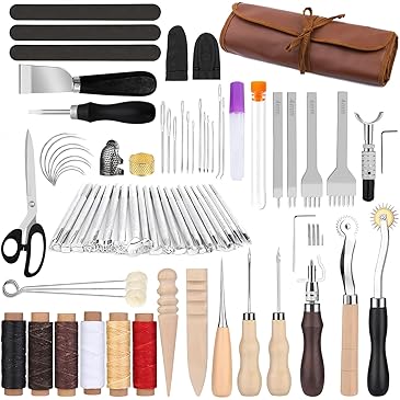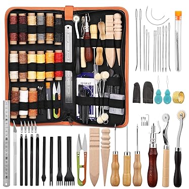 ステッチンググルーバー、菱目打ち、 蝋引き糸、コバ磨き 研磨ツール、千枚通し、ウールダーバー 、革用手縫針 、指サック 、パンチツール、はさみなど