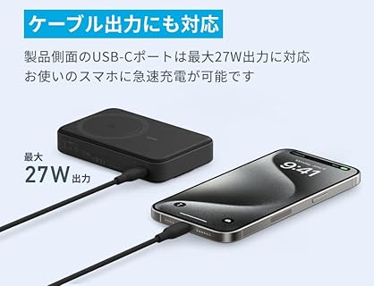 製品側面のUSB-Cポートは最大27W出力に対応し、お使いのスマホに急速充電が可能です。